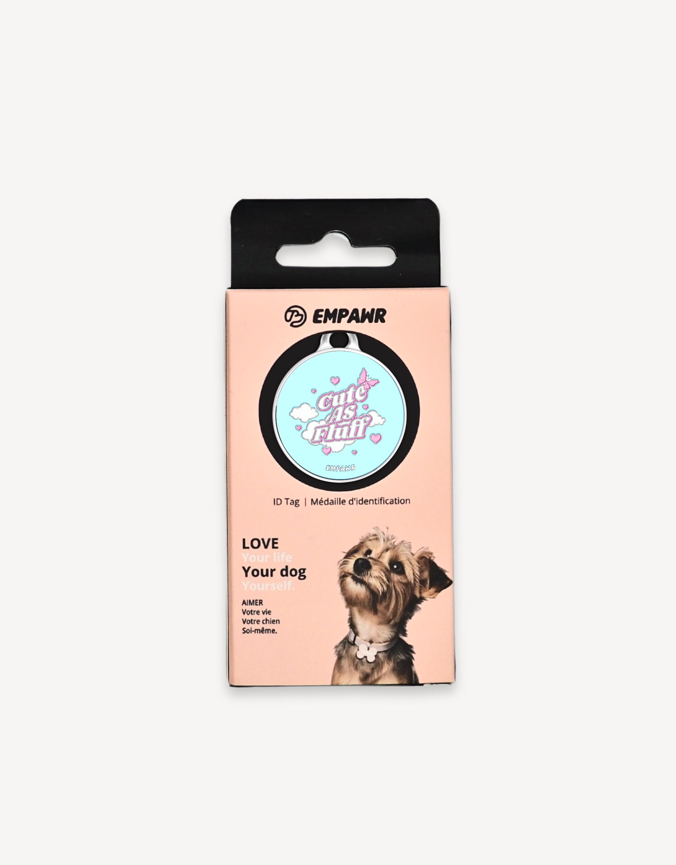 elevate your dog's cuteness with the timeless EMPAWR dog tag - cute as fluff round classic, adorned with ☁️🦋💕 symbols. this round classic custom dog tag is not just an accessory; it's a full-flown trendsetting statement showcasing your dog's adorable spirit.